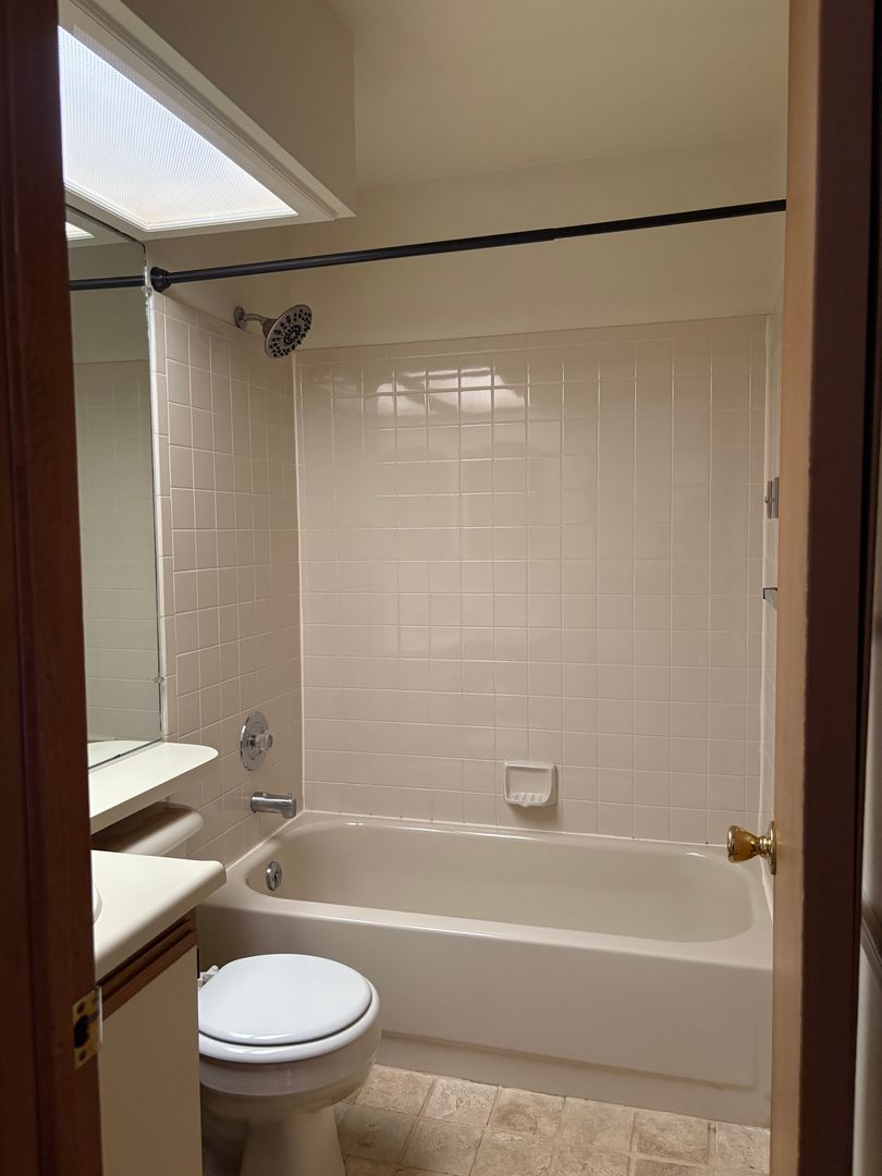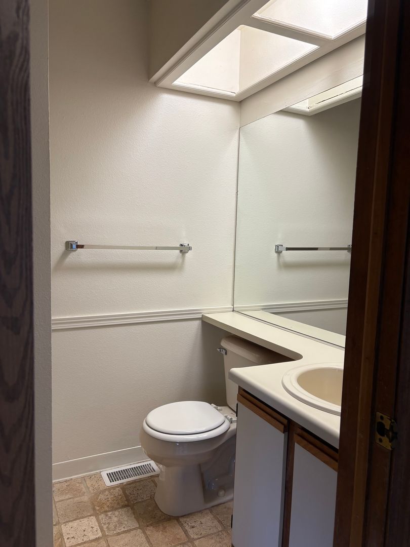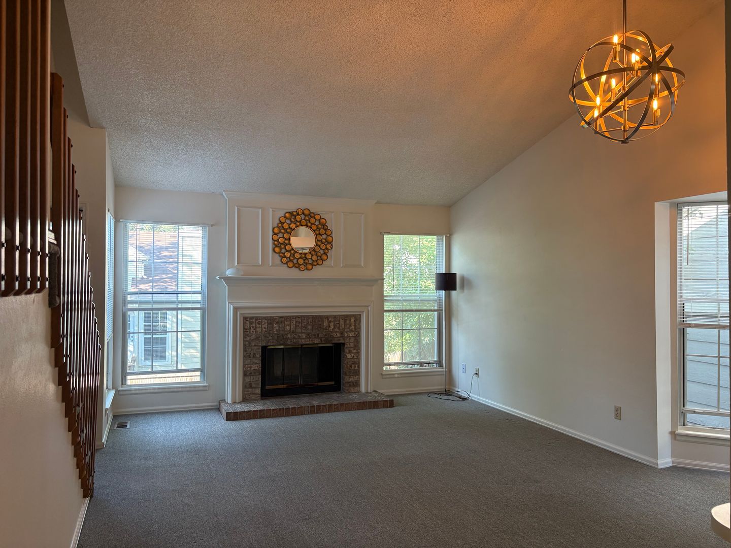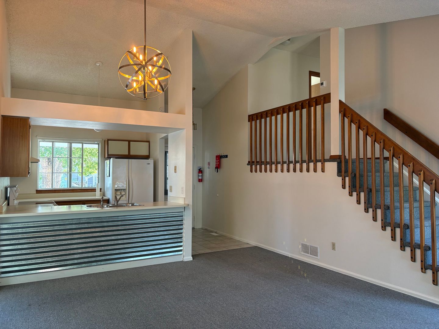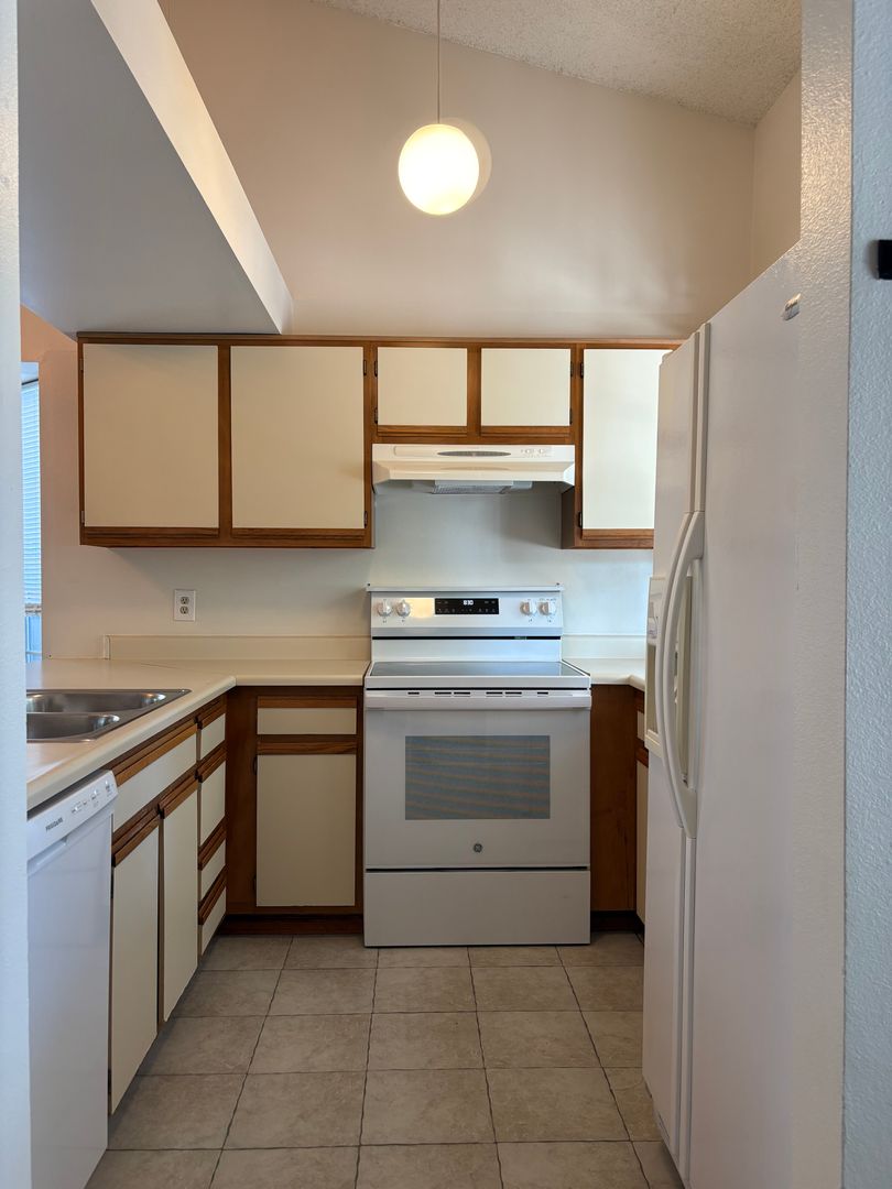 The main living area is filled with natural light from six large windows. Its open-concept design features vaulted ceilings and a kitchen with a brand-new range/oven and dishwasher.