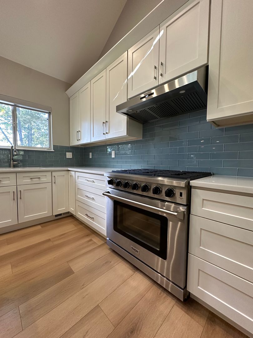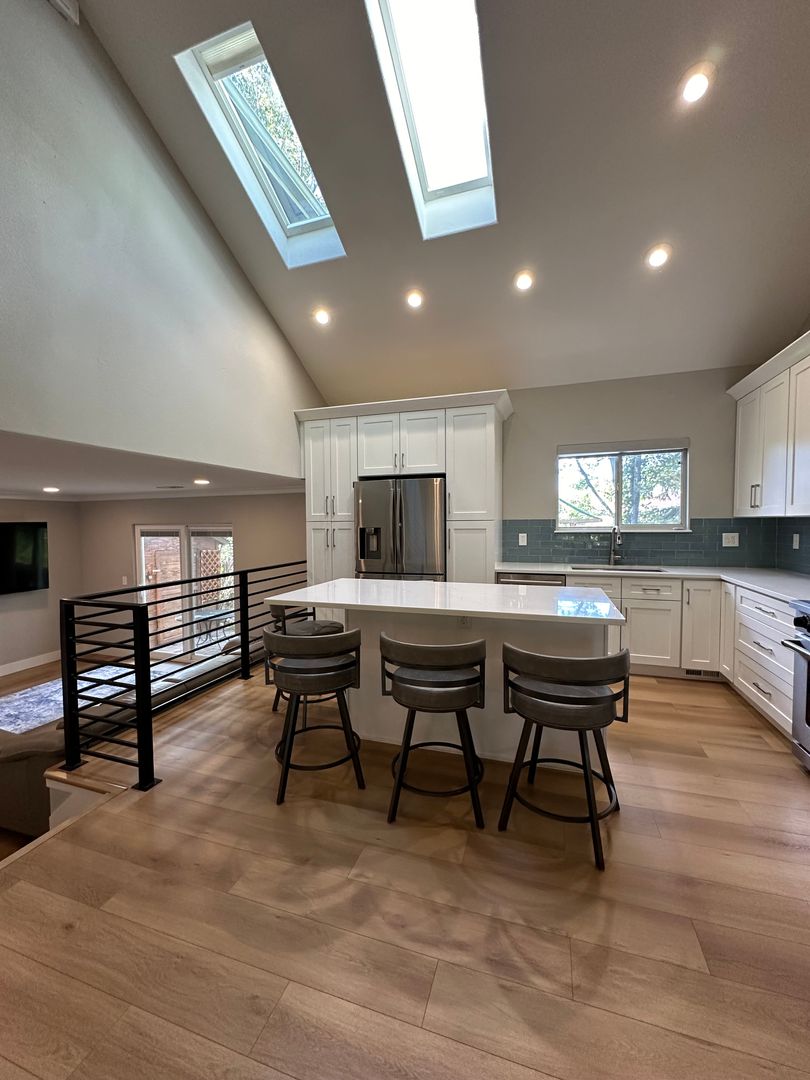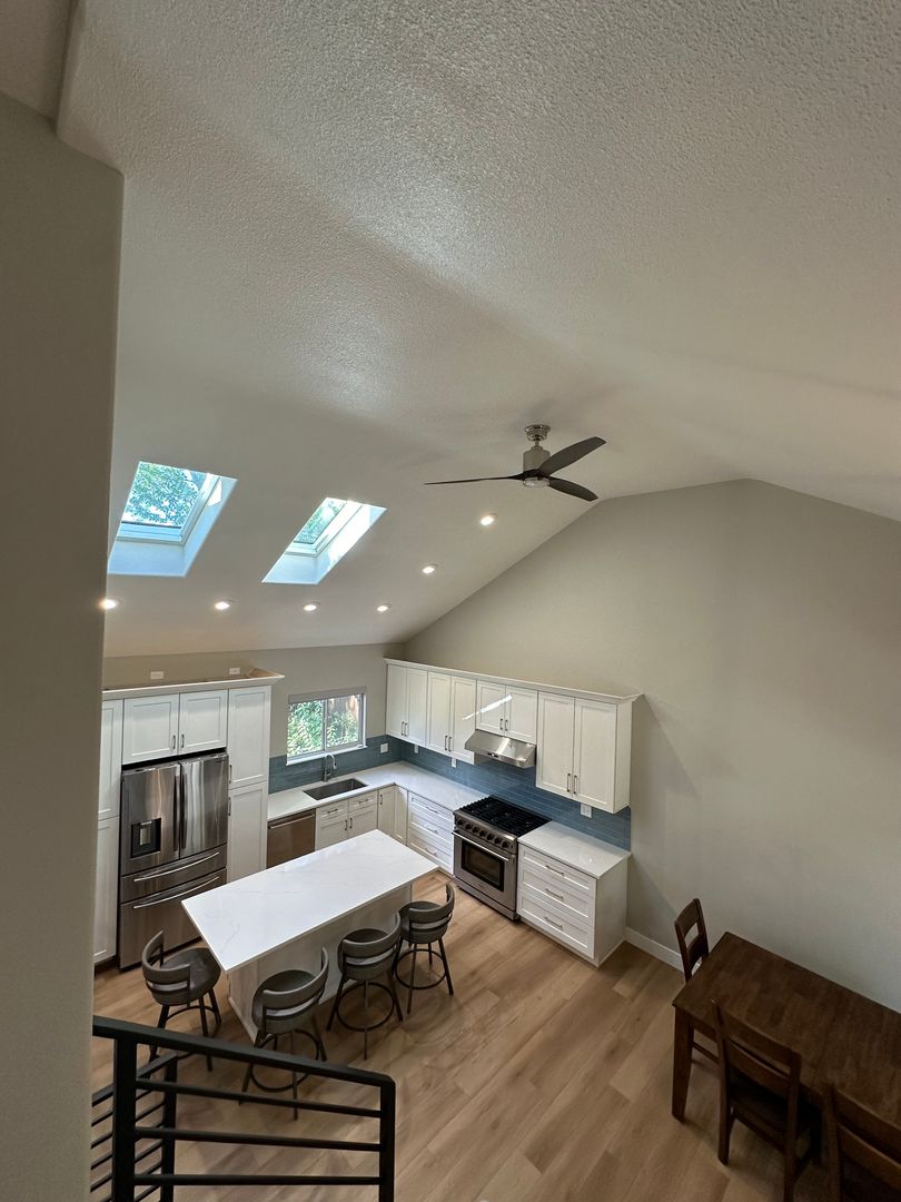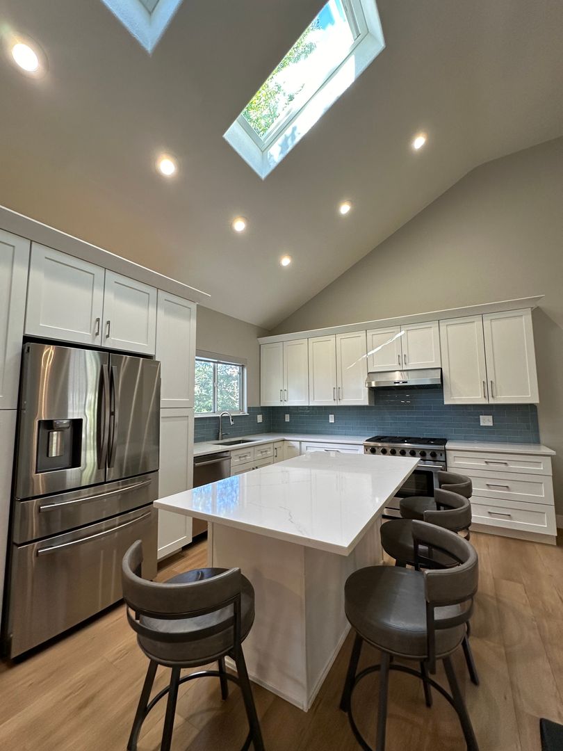 The main floor is an open concept with vaulted ceilings and two large skylights that flood the entire main levels with natural light. The gourmet kitchen is equipped with quartz countertops, large island with built-in microwave, Thor gas stove and views of the lush backyard.