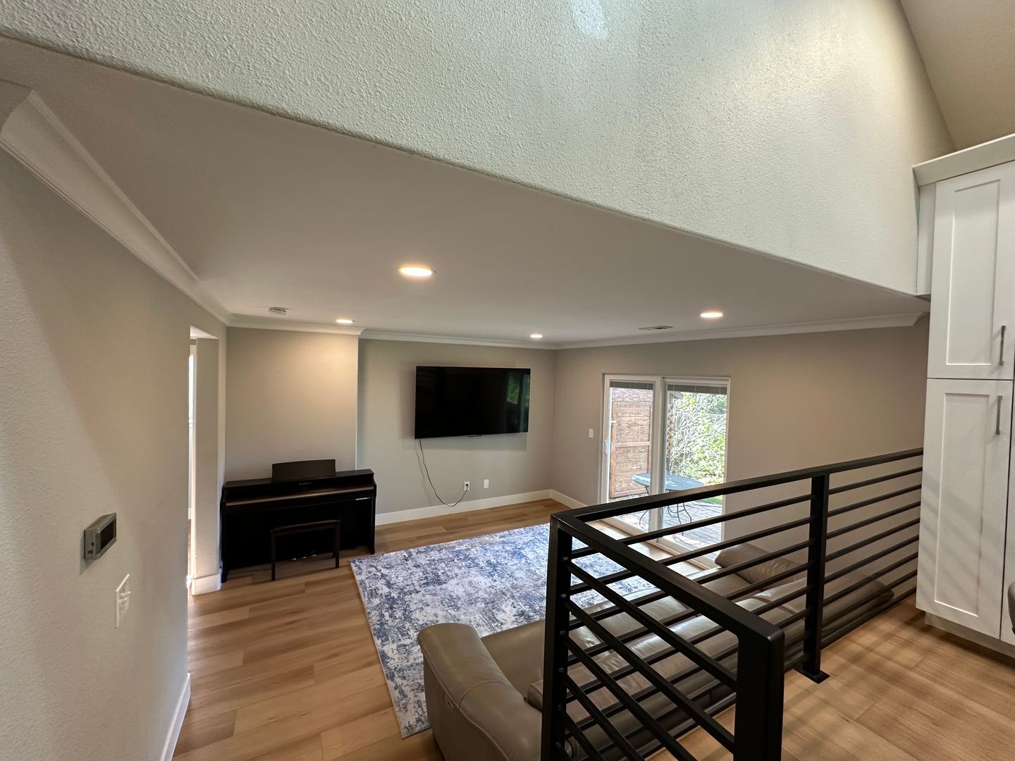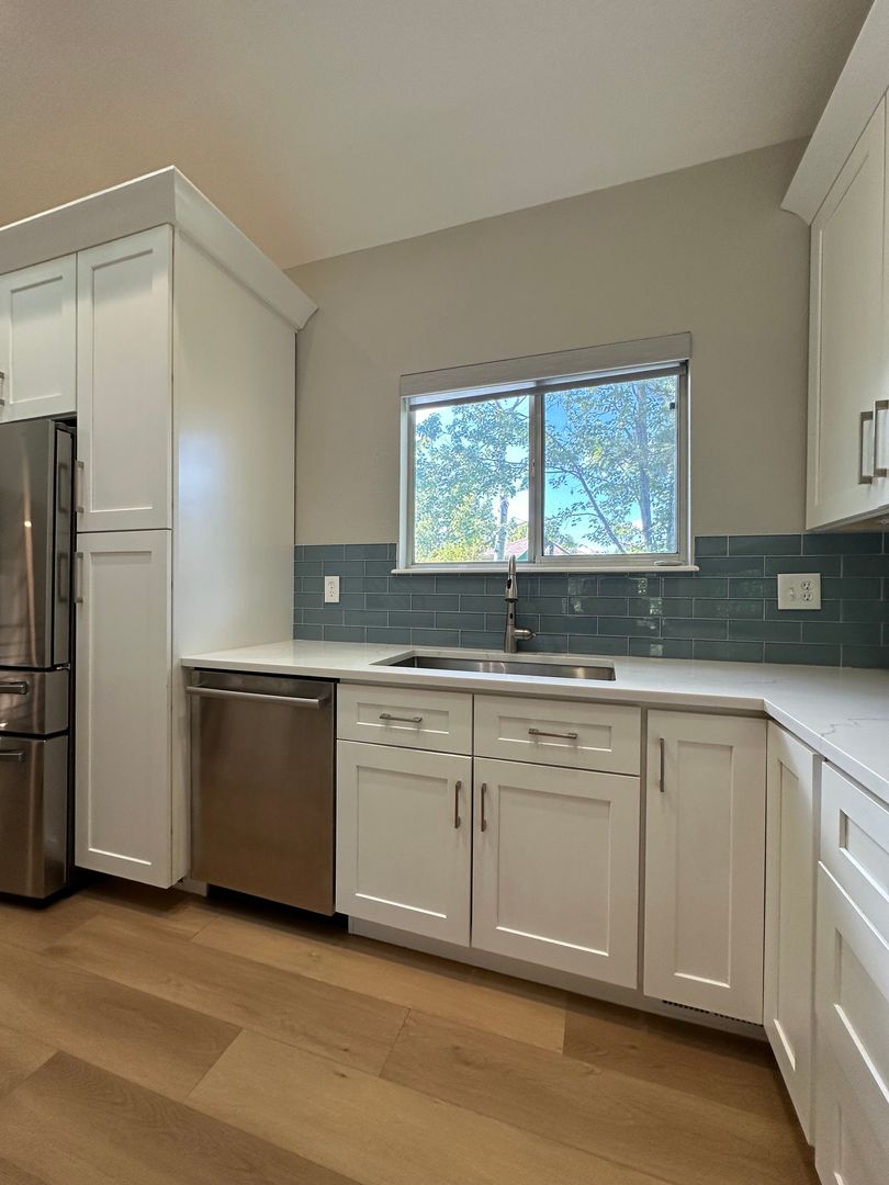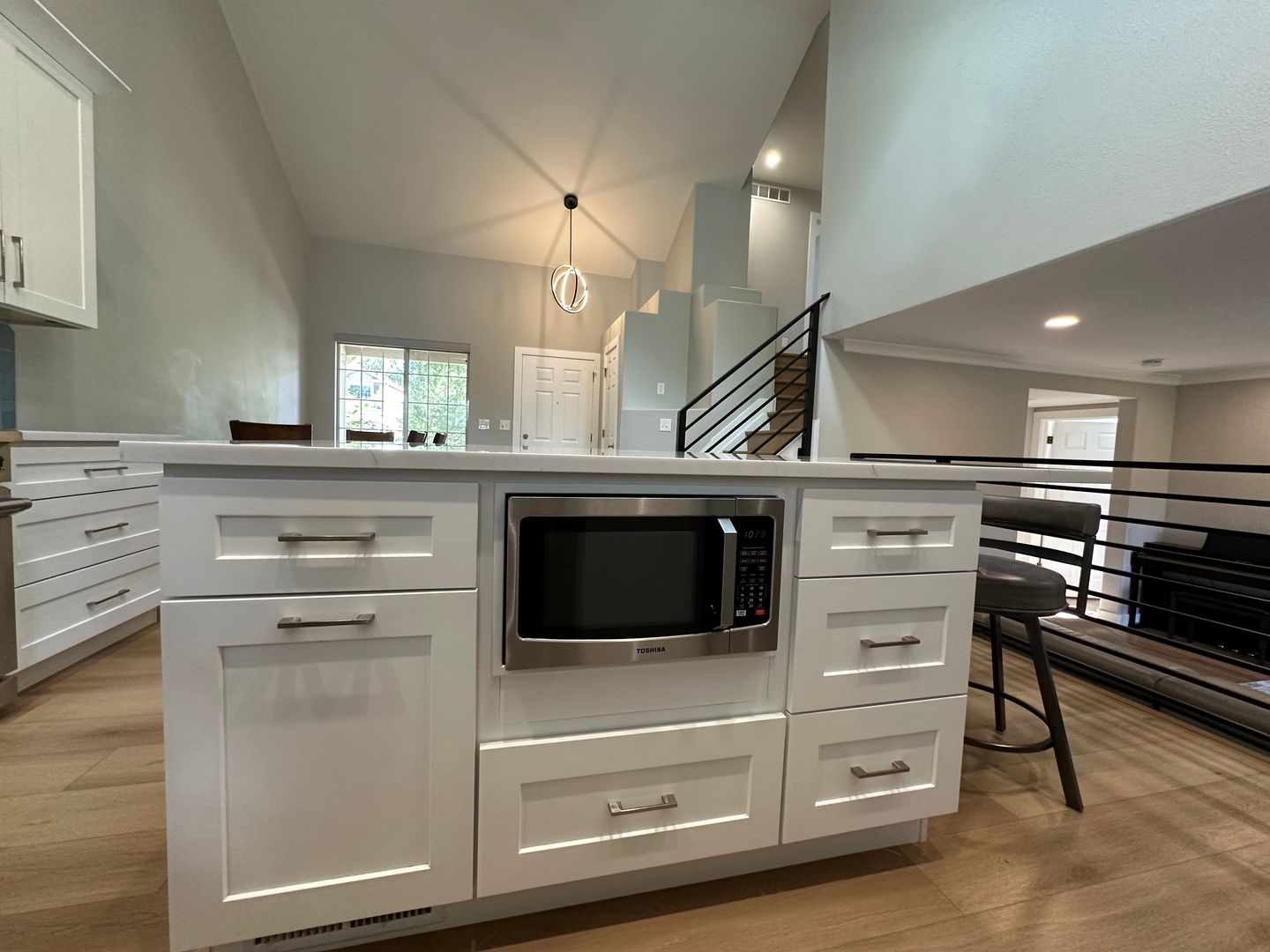 The main floor is an open concept with vaulted ceilings and two large skylights that flood the entire main levels with natural light. The gourmet kitchen is equipped with quartz countertops, large island with built-in microwave, Thor gas stove and views of the lush backyard.