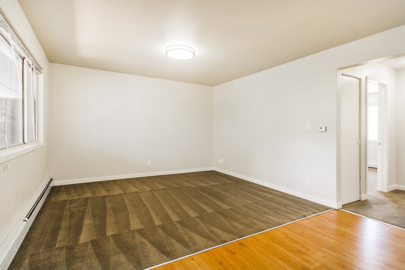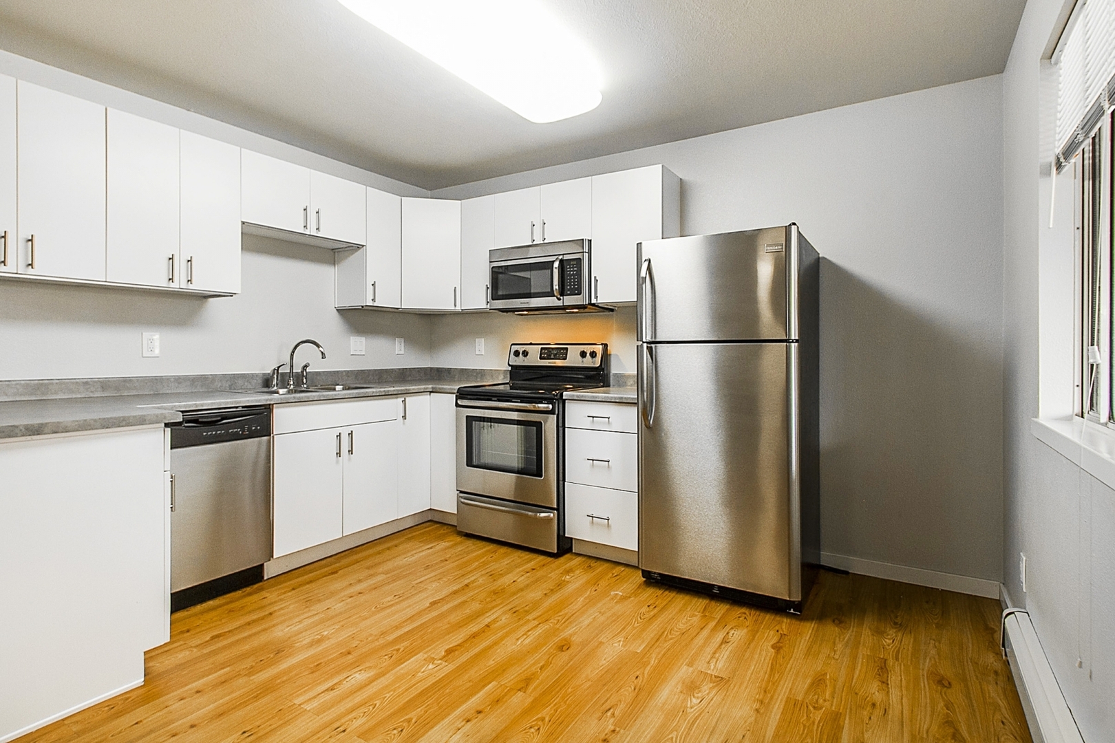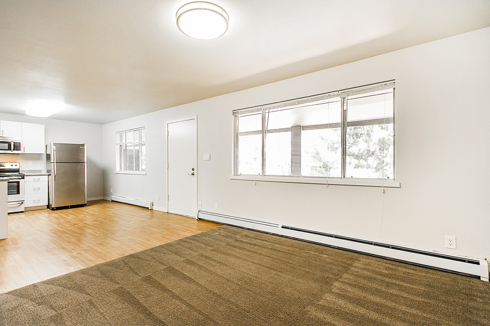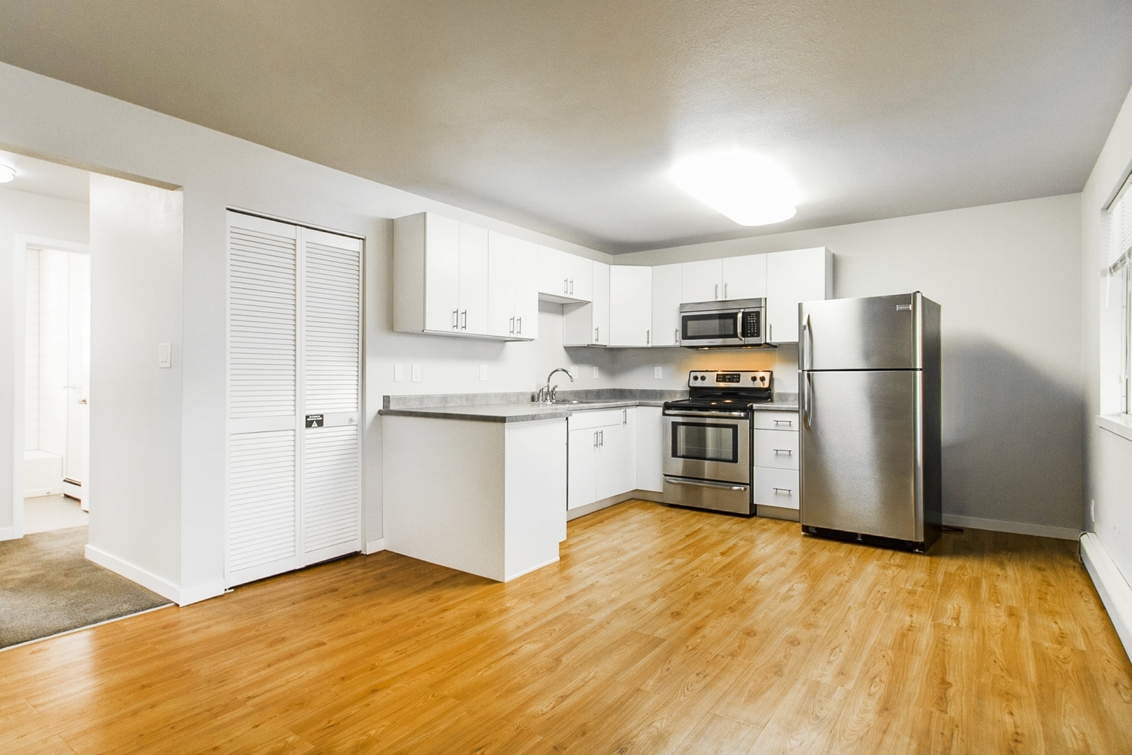 Enjoy beautiful faux hardwood floors in the living room and kitchen, adding warmth and character.