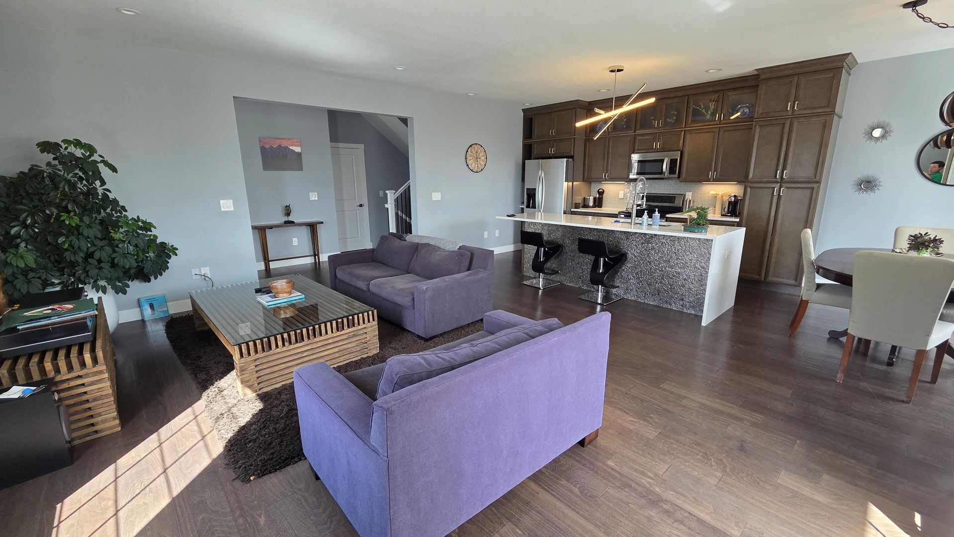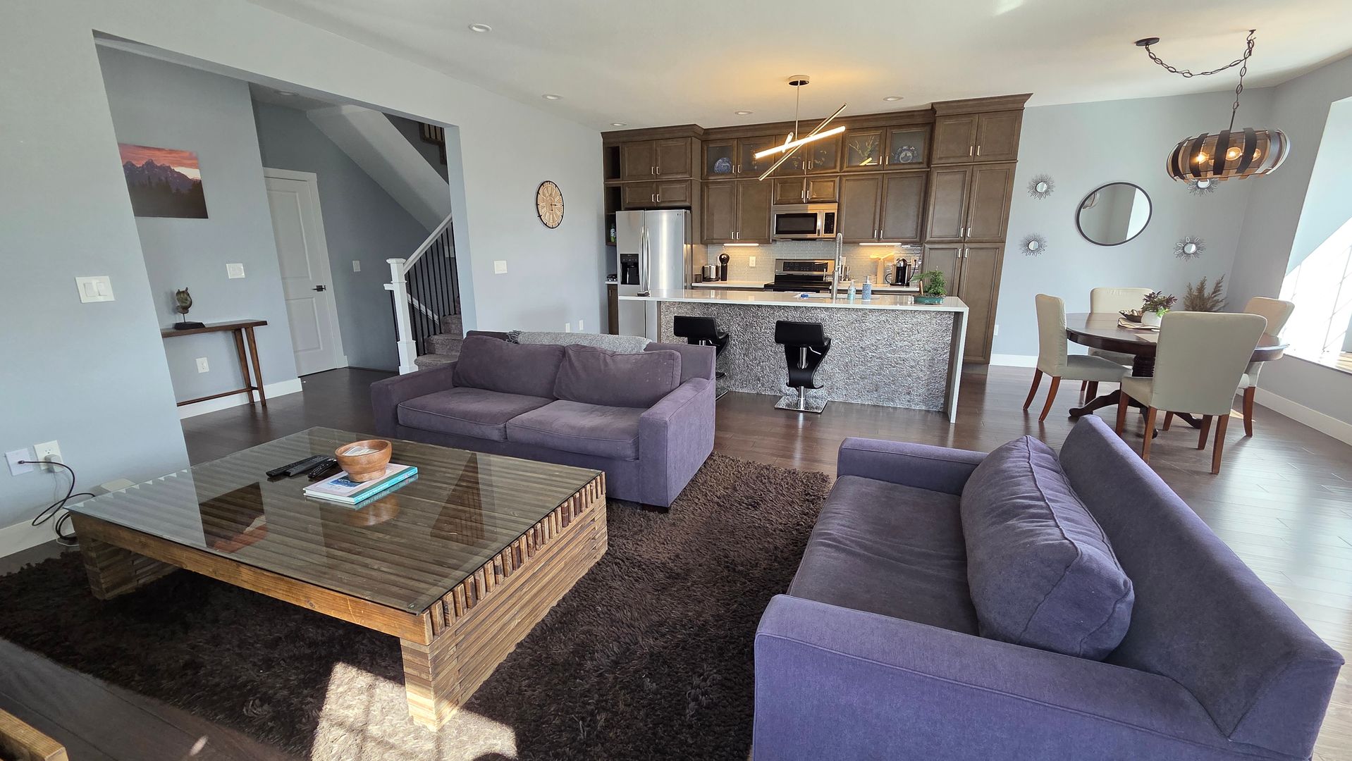 The main level is warm and inviting, showcasing a well-appointed kitchen with granite countertops, soft-close cabinetry, and stainless steel appliances. A comfortable living area opens to a private patio, perfect for relaxing or entertaining, while the dining space offers an ideal spot for everyday meals. A main-floor bedroom with a full bathroom adds versatility for guests or versatile living arrangements.