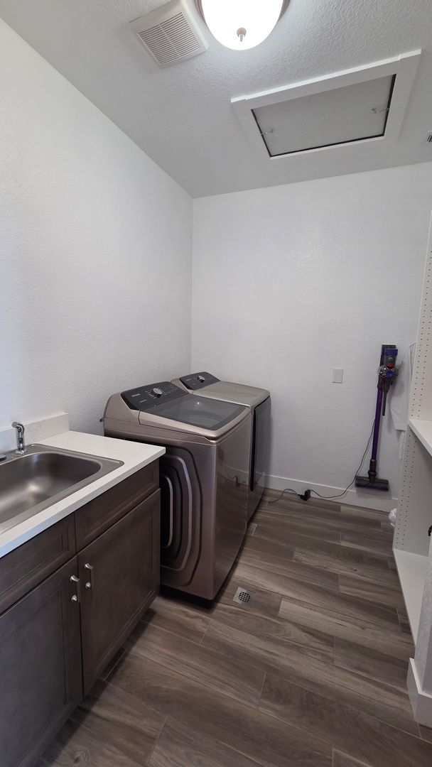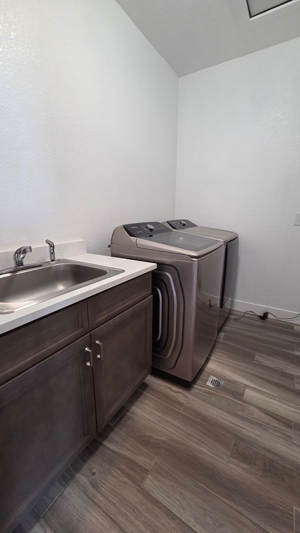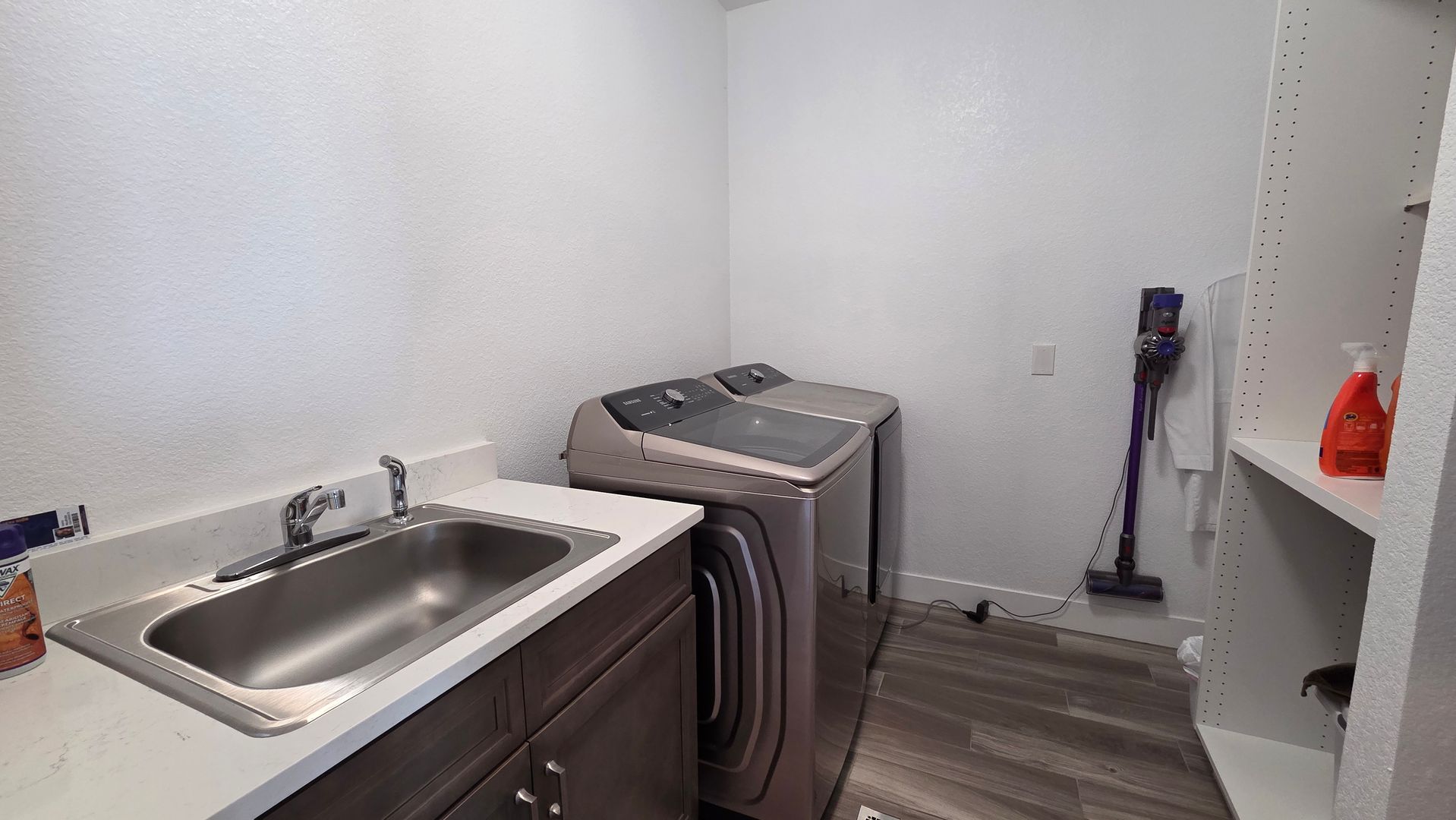 Upstairs, the spacious primary suite includes a five-piece bathroom and a walk-in closet. An additional bedroom with its own ¾ bath, along with a dedicated laundry room featuring a utility sink, cabinetry, and washer/dryer hookups, completes the upper level.