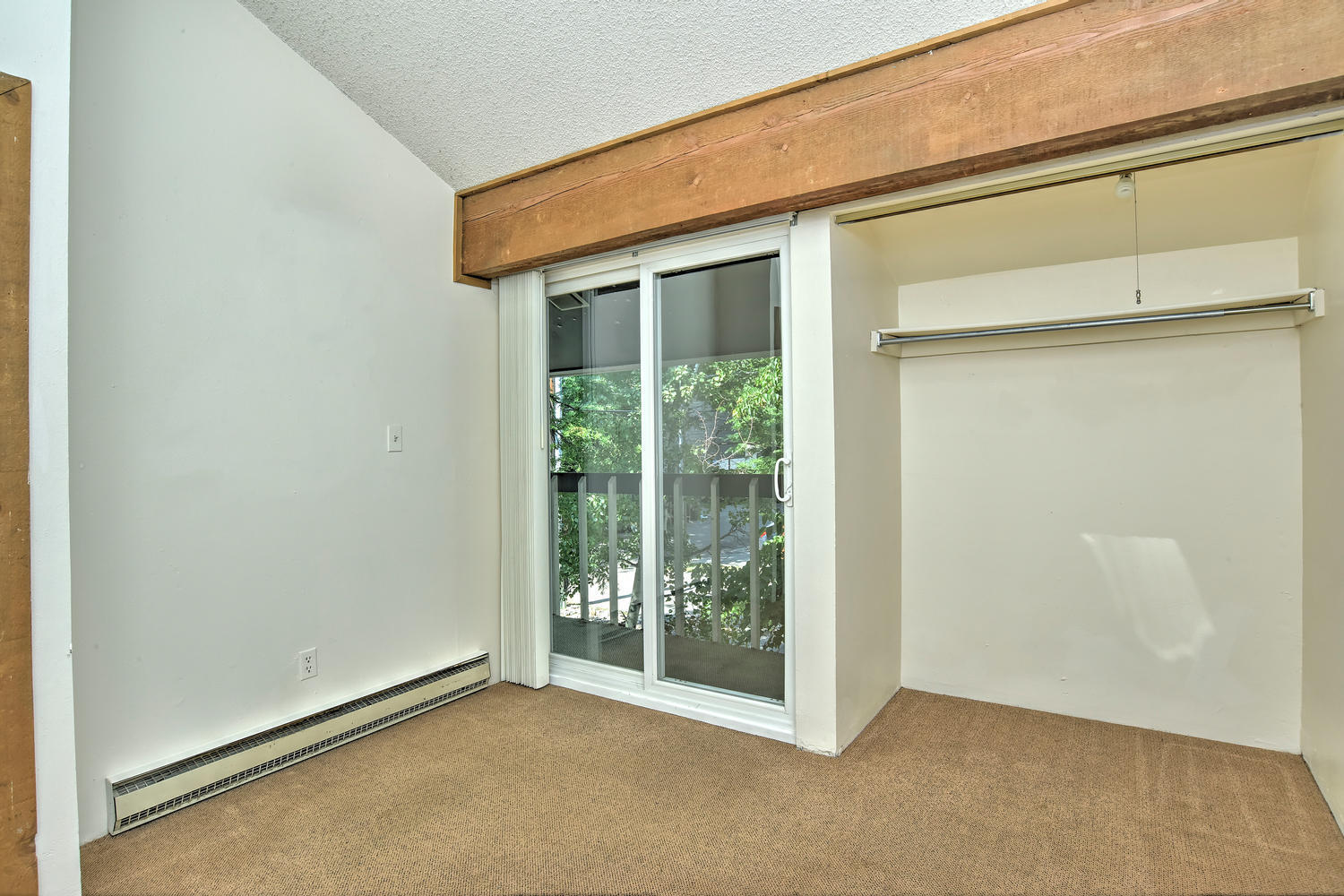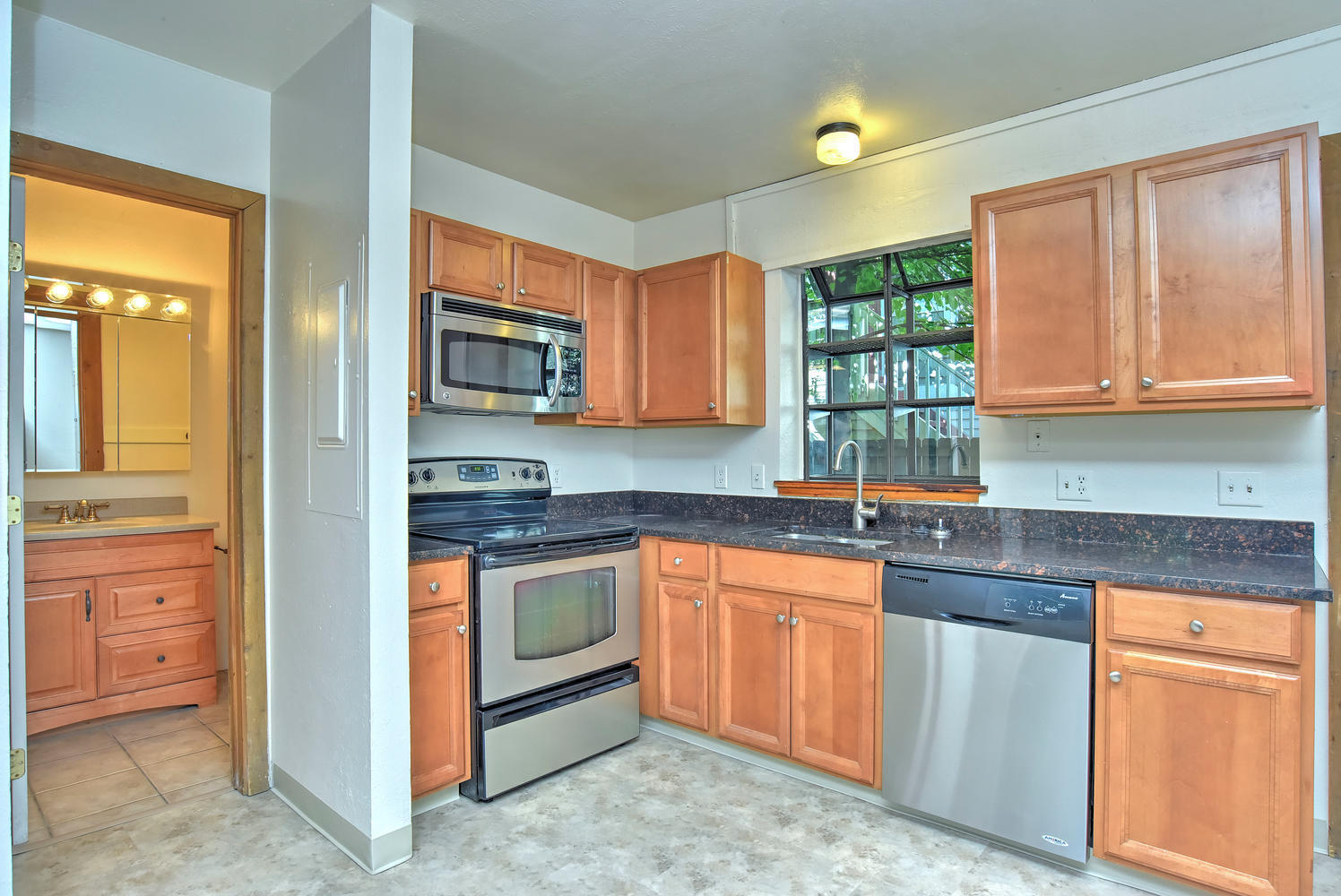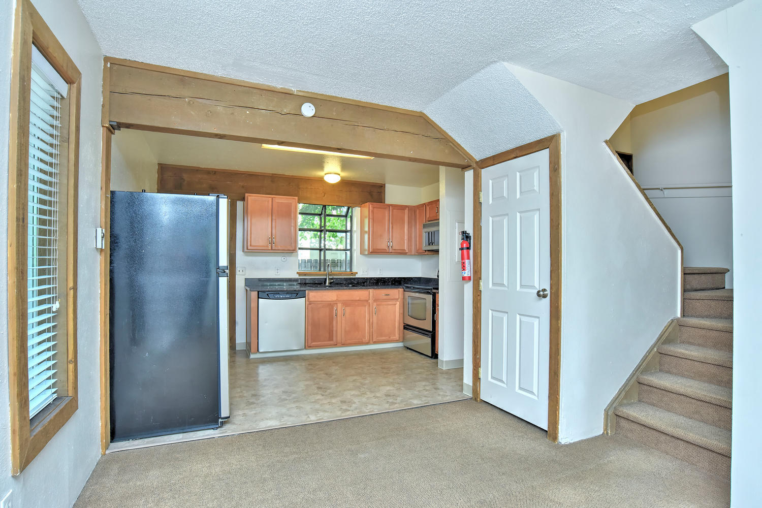 The living room opens up to a spacious kitchen featuring updated cabinets and stainless steel appliances. Each bedroom comes with vaulted ceilings, skylight and balcony access.