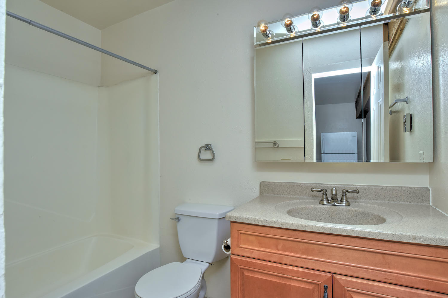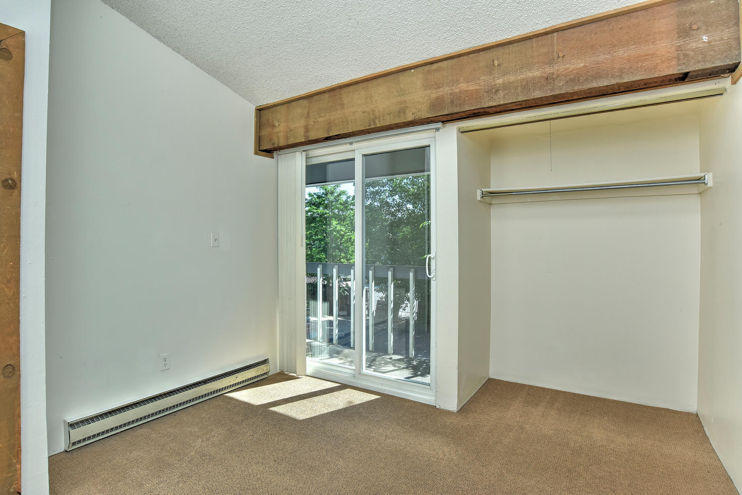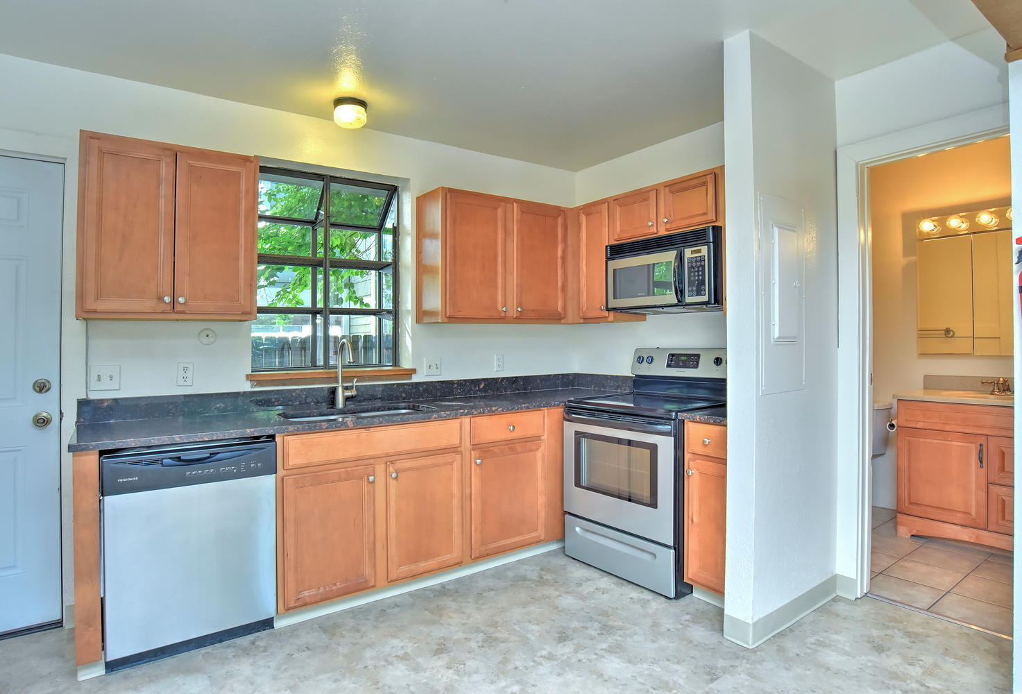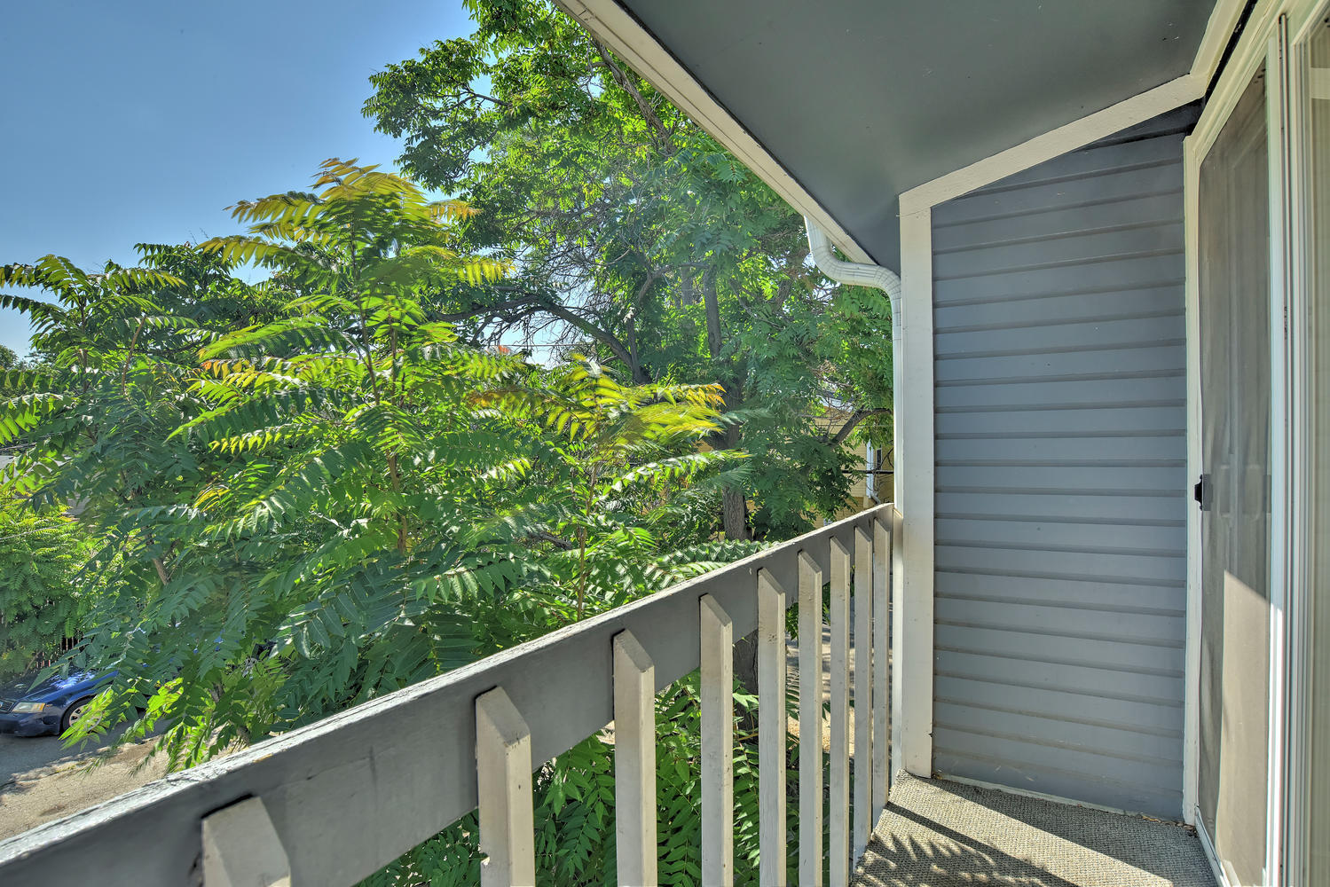 The living room opens up to a spacious kitchen featuring updated cabinets and stainless steel appliances. Each bedroom comes with vaulted ceilings, skylight and balcony access.